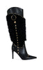 Black faux leather knee-high stiletto boots with a pointed toe, faux fur paneling, and gold stud accents for a luxe, statement edge.