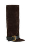 We did it for you. Tall point-toe boot with a foldover shaft and oversized belt buckle detail, serving bold structure with a fashion-forward edge.