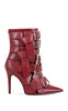 Point-toe stiletto bootie with multiple belted straps and silver buckle accents, an edgy cool-girl statement for bold, fashion-forward looks.