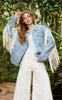 Denim jacket with white fringe detailing along the shoulders and sleeves, a playful western-inspired piece that adds movement and statement to any outfit.