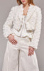 Wear the roses with the BRIARROSE, a sculptural masterpiece covered in lush 3D rosettes. This crisp white, mid-weight jacket features a 17 3/4" cropped fit and an effortless open-front lapel, perfectly blending high-fashion drama with a romantic aesthetic.