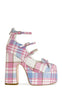Platform closed-toe heel with delicate bow and skinny buckle straps, featuring a soft pink and blue plaid pattern for a playful yet polished statement.