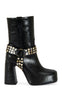 Platform bootie with a chunky block heel and bold embellished moto details — the perfect mix of edgy attitude and high-fashion polish.