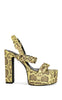 Own the spotlight with TARYNN, the Yellow Snake platform sandal that turns every sidewalk into your personal runway. This "extra" essential pairs a fierce snake-print synthetic upper and gold hardware with a sky-high block heel balanced by a sturdy platform—all the height you crave without the drama. Featuring an adjustable ankle buckle and a flirty round-toe silhouette, TARYNN is your new go-to for making a serious statement.