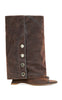 Washed brown velvet denim foldover peep-toe bootie, designed with silver snaps for a bold, fashion-forward twist.